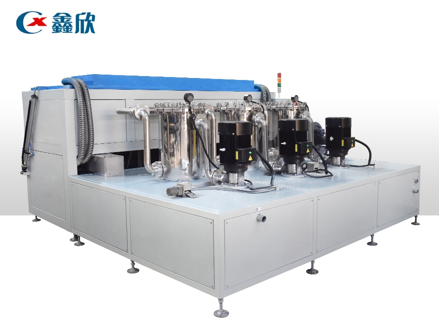該設備有上下料網帶、超聲波清洗工位、噴淋漂洗工位、高壓風切、熱風烘干工位、溫控水加熱系統、風機、溫控空氣加熱系統、移動式風刀、PLC+觸摸屏控制系統、管路系統及智能電器控制系統等組成。自動進排液和自動